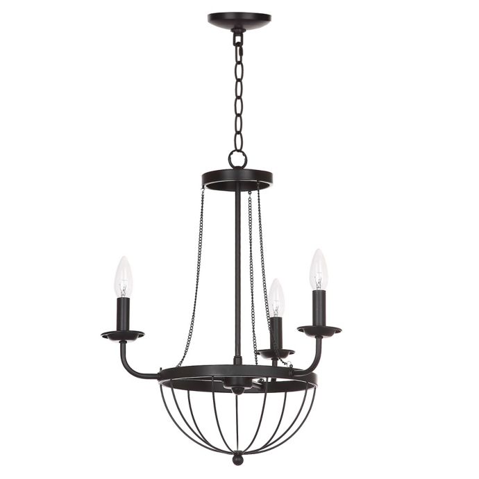Barrington 3 light chandelier features a distressed black metal and a wood tone finish that adds charm to any room. Champignon 3 light chandelier. It has strings of decorative acrylic beads and jewels and also comes complete with a chrome ceiling cap and chain to adjust the height.