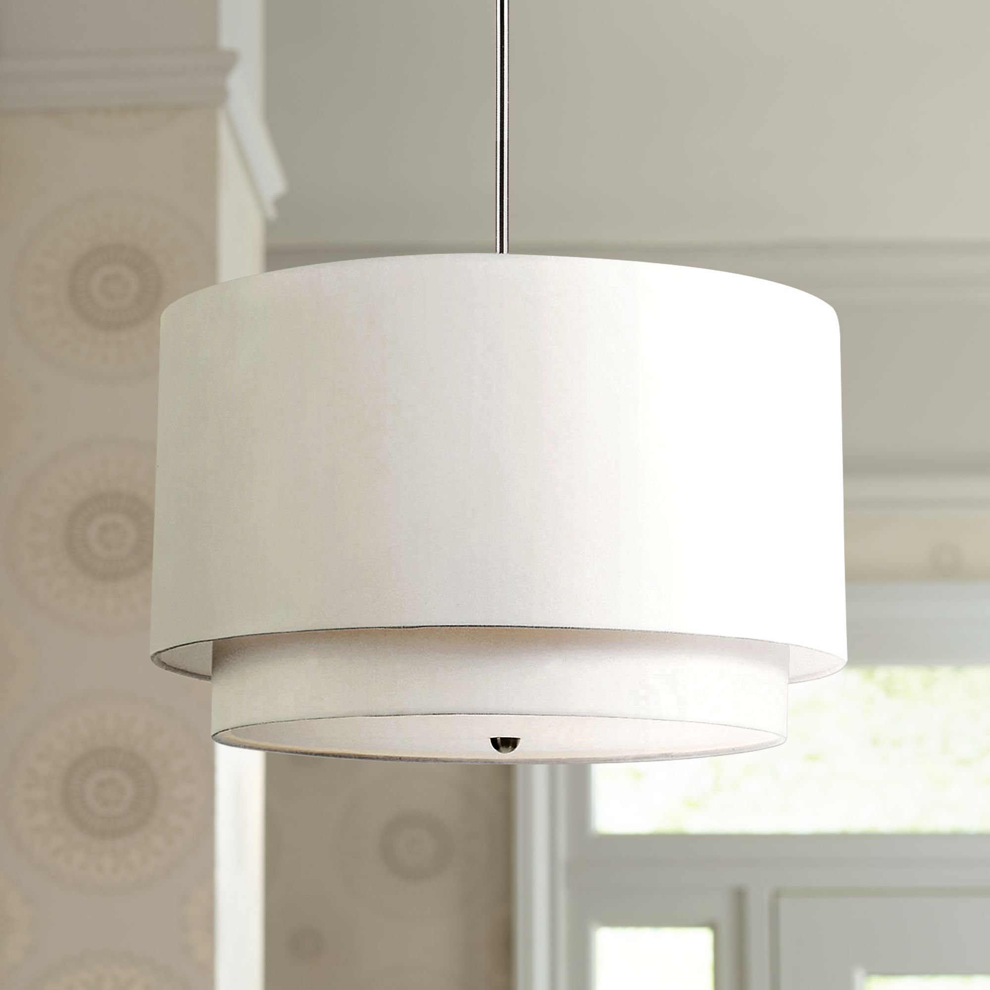 The clean lines of the steel frame add interest while the fabric shade and glass diffuser softens the light to create a warm ambiance. By artika 9 81 05. Rondin 18 wide brushed nickel white 3 light pendant.