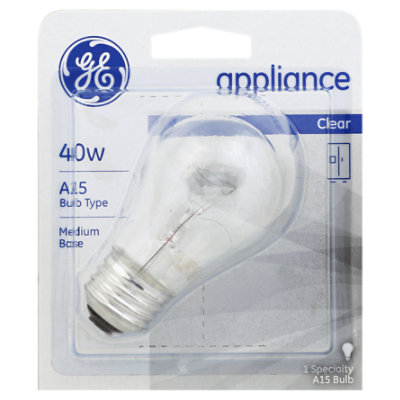 Ge appliance incandescent light bulb a15 bulb 40 watt 415 lumen medium base soft white 1 pack oven light bulb refrigerator light bulb microwave light bulb 4 5 out of 5 stars 2 916 40 watt appliance light bulb high temp resistance microwave oven bulb e17 indicator intermediate base t8 tubular incandescent light bulbs dimmable pack of 8. Buy products such as ge incandescent 40w a15 appliance light bulb clear finish medium base 1pk at walmart and save. Ge 25 watt appliance light bulb.
