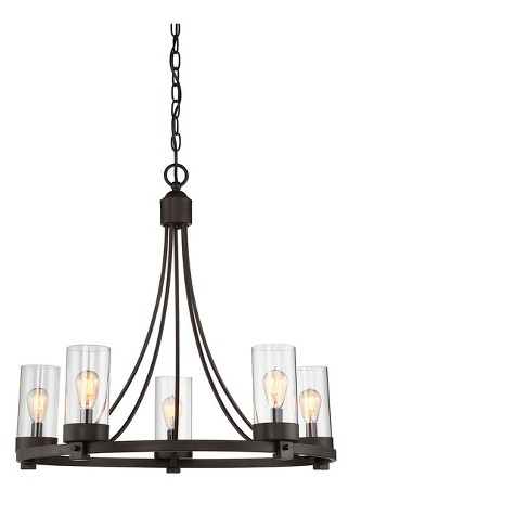 Chandelier lighting also hangs from the ceiling but features a branched system with many lights as opposed to one light like pendants. Filter 1 evans glass globe pendant 98 99 198 99 199 399. The modern lines of this 36 in 5 light bath light fixture in a tannery bronze powder coat with satin etched glass will blend into many decors.