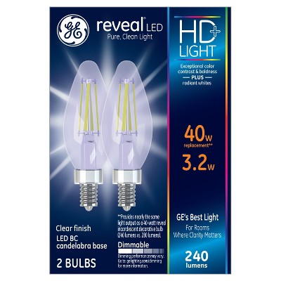 General electric 2pk 40w reveal hd filament equivalent deco bc blunt tip candelabra base led light bulb. The candelabra base is usually smaller around 12mm in diameter and is usually found among light bulbs in the e12 bulb category. A variety of types styles have been custom designed for any application.