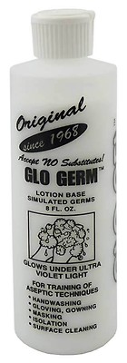 Used throughout the united states in schools hospitals and food services glo germ consists of an odorless lotion or powder which glows brightly when exposed to ultraviolet light. Fluoresces brightly under a black light and is a highly effective educational tool. This set comes with an 8 oz.