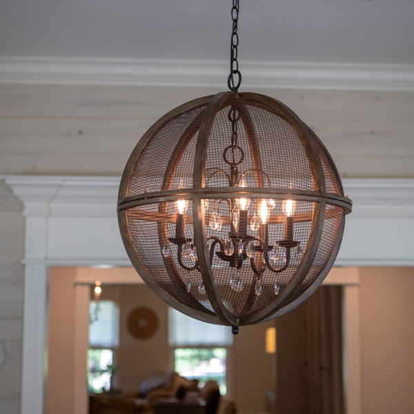 Find globe chandeliers at lowe s today. With its clean lined interlocking circles open aired frame and candelabra this globe chandelier is just the right starting point or finishing touch for fresh takes on traditional and farmhouse rooms. Mesh globe 5 light chandelier.