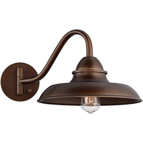 Industrial pendants for farmhouse. Wheeler esso wall sconce. Suspended from a round sloped ceiling compatible canopy and an adjustable hanging cord this metal fixture features a dome shaped shade finished in oil rubbed bronze with gold toned accenting inside for subtle contrast.