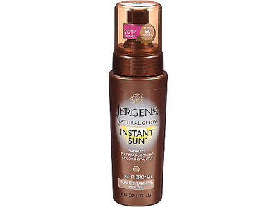 Choose your desired shade of jergens natural glow instant sun sunless tanning mousse light bronze or deep bronze. Jergens natural glow instant sun sunless tanning mousse uniquely works with your skin tone to mimic results from the natural sun. Instantly creates a flawless natural looking tan even when the beach is miles or months away with advanced color complex the airy mousse works with your skin s natural tone to mimic results from the sun.