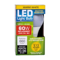 Rated 4 out of 5 stars 977 total votes. 60 watt equivalent a19 non dimmable led light bulb soft white 8 pack this ecosmart a19 light bulb s estimated this ecosmart a19 light bulb s estimated energy cost is usd 1 08 per year. These great eagle 9 watt led 60 watt equivalent bulbs have a lifespan of 10 000 hours.