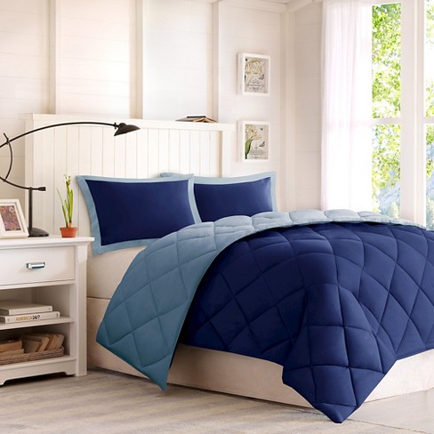 Comforters keep you warm all night long. Machine wash on. 2pc twin twin xl windsor reversible down alternative comforter set with 3m stain resistance finishing navy light blue.