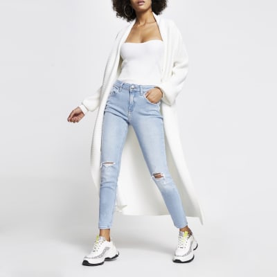 The 12 best light wash jeans for summer. Destroyed slim cut denim jeans light blue. Classic sweetheart skinny jeans light blue wash.