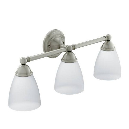 Featuring flared glass globes this light fixture adds a luxurious feel to any bathroom. Through the flo by moen mobile app or your web browser you can see if the smart water valve detects an issue and be alerted so you can fix it before that issue causes damage. Moen yb5163bn voss 3 light dual mount bath bathroom vanity fixture with frosted glass brushed nickel.