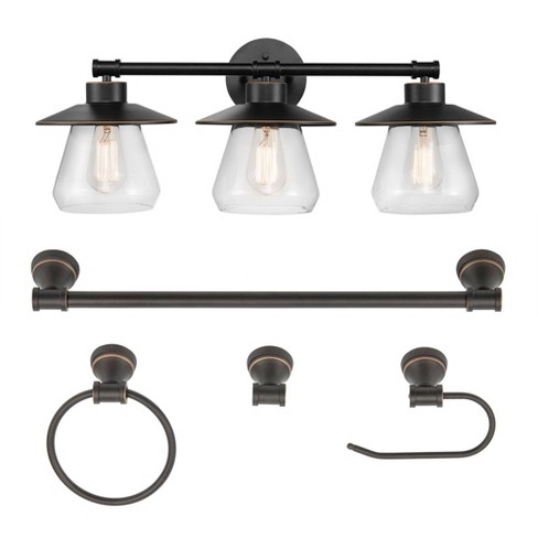 Dewenwils 3 light vanity light fixtures 5 piece all in one bathroom set light fixtures with clear glass shades towel bar towel. Get it as soon as thu nov 19. Finished in oil rubbed bronze features.