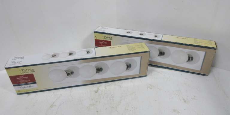 Patriot lighting palms 3 light vanity. This fixture features a brushed nickel finish with clear ribbed globes that ensure crisp lighting. This polished chrome light fixture has white plastics shades that measures 5 wide 10 48 high.