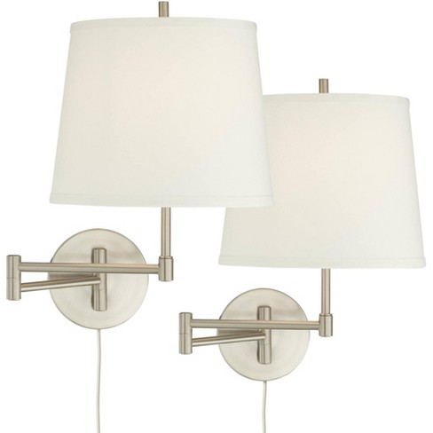 Each light has a white frame with a frosted white acrylic diffuser and its extra long cord has an on off switch built right in. With an adjustable swing arm this wall lamp serves as the ultimate task light dual pivot points allow you to position the light in the perfect position while the built in outlet allows you to plug in small items like a phone charger hot glue gun or any other items you need to work or craft from home. 360 lighting modern swing arm wall lamps set of 2 brushed nickel plug in light fixture off white drum shade bedroom living room.